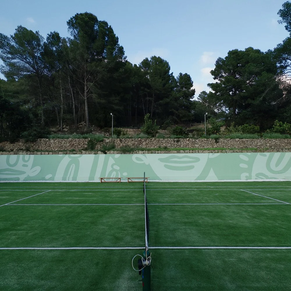 Während meiner aktuellen Residency arbeite ich an einer Wandmalerei auf einem Tennisplatz. Was mich hier besonders beschäftigt, ist der Umgang mit dem Ort selbst. Auf Mallorca ist mir aufgefallen, wie stark Architektur und Farben an die Natur angepasst sind.